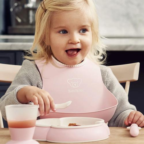 Peralatan makan ini memiliki detail yang dirancang dengan cermat yang sesuai untuk anak-anak yang masih sangat kecil. Bentuk piring yang menyerupai trefoil memudahkan menyendok makanan, sementara strip di bawahnya mencegah piring bergeser. Sendok dan garpu dibentuk agar tidak meluncur ke dalam piring, dan gagangnya yang pendek mudah digenggam. Gelasnya stabil, mudah dipegang, dan isinya dapat dilihat melalui plastik buram. Tali leher celemek yang lembut dapat disesuaikan, dan kantong tumpahan yang dalam menampung makanan dan kotoran. Peralatan makan bayi ini sangat cocok untuk anak-anak yang ingin mulai makan sendiri (dan orang tua yang ingin meminimalkan kekacauan).