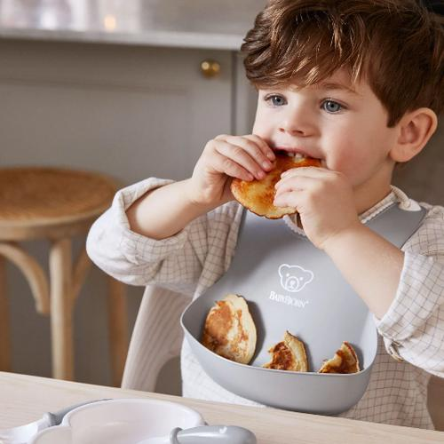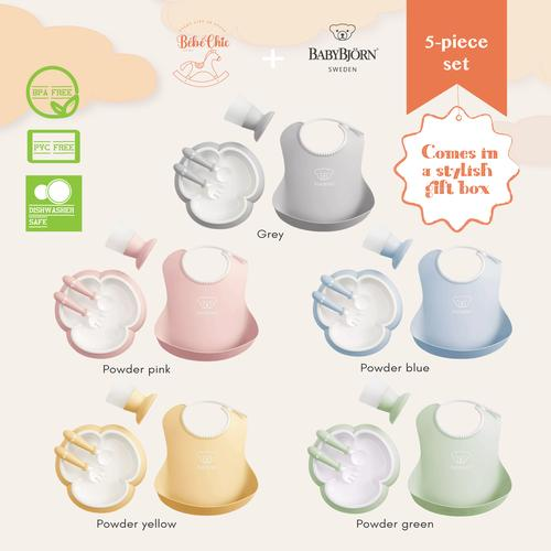 Semua produk dalam perlengkapan makan bayi (termasuk celemek) mudah dibersihkan dan aman untuk dicuci di mesin pencuci piring.