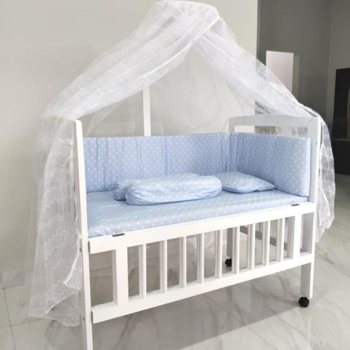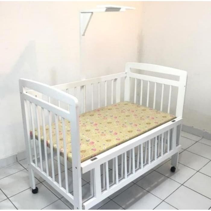 GOOD DEAL AND LIMITED TIME YA MOMS Bahan: Solid Wood jenis kayu karet/mahoni Ukuran : P X L X T : 119 CM x 71 CM x T 108 CM Ukuran mattress dasar: 114cm X 63cm X 4.5cm Tebal Busa: 2,5cm Tinggi tiang kelambu: 145cm Tinggi posisi matras atas: 60cm Tinggi posisi matras bawah: 30cm PIlihan warna: Putih Keunggulan: Tinggi kasur dapat disesuaikan 2 posisi Kasur menggunakan bahan kedap air Tatakan dasar kasur di finishing dan memakai pilihan kayu keras Sistem Knock down (dapat dirakit sendiri, dilengkapi petunjuk pemasangan) Pengiriman dilakukan paling lambat 4-5 hari (tidak termasuk weekend dan hari libur nasional) setelah pesanan kami terima Barang yang sudah dibeli tidak dapat ditukar dengan alasan salah ukuran, tidak muat dan salah warna. Kekurangan atau cacat barang tanpa video unboxing tidak akan digantikan baby box ranjang bayi baby crib side bed box baby tempat tidur buka samping kayu merk Holly free kelambu amp; free bumper set bemper set tanpa kelambu
