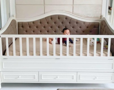 Box bayi ukuran jumbo bisa untuk usia dewasa Bahan baku : Kayu mahony oven Finishing : Cat duco putih (Bisa custom warna) Coating : Doff / Glossy bisa custom Ukuran : 120cm x 200cm Ranjang bisa disetting 2 level bawah dan tengah Pagar depan bisa dibuka lipat tengah, pakai engsel Terdapat 3 laci laci yang bisa untuk menyimpan barang barang kebutuhan bayi Free tiang kelambu Bagian headboard dan samping kanan kiri box dijok dengan busa royal foam soft, kain bludru warna bisa request