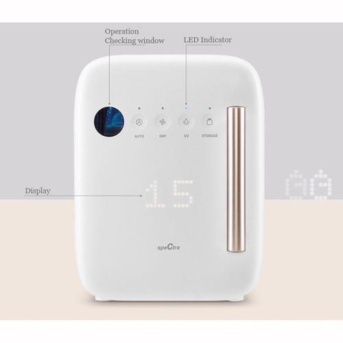 Spectra UV Sterilizer adalah alat sterilisasi menggunakan sinar UV sehingga dapat meminimalisasi suhu panas pada bahan atau wadah makan dan minum balita atau bayi yang terbuat dari plastic. Proses sterilisasi ini hanya menggunakan suhu -+40 derajat untuk pengeringan dan sinar ultraviolet untuk mematikan kuman. Selain itu Spectra UV sterilizer juga dapat digunakan untuk mensterilkan benda-benda lain yang sulit bahkan tidak mungkin disterilisasi menggunakan steril konvensional. Keunggulan Spectra UV Sterilizer : - 3 Fan, Memiliki 3 kipas. 1 kipas besar (ventilator fan) yang berfungsi sebagai pengering dan juga sebagai sirkulasi udara atau pembuangan hawa. Dan 2 kipas kecil yang berfungsi hanya sebagai pengering. - Memiliki lekukan tanpa siku pada permukaan stainless steel sehingga membuat sinar UV dapat terefleksi hampis sempurna kesemua permukaan benda yang disterilisasi. - Menggunakan 2 lampu merk osram buatan Italy yang mampu membunuh kuman hingga 99,9%. Dilengkapi fitur pengaman auto off pada lampu UV saat pintu dibuka Fitur yang terdapat pada Spectra UV Sterilizer - Auto : menjalankan secara otomatis proses pengeringan dan dilanjut proses sterilisasi. Pada Auto terdapat 3 waktu, 20 menit, 30 menit dan 40 menit - Dry : menjalankan hanya proses pengeringan saja tanpa dilanjutkan proses sterilisasi. Pada mode Dry terdapat 3 waktu, 10 menit, 20 menit dan 30 menit. - UV : menjalankan proses sterilisasi saja menggunakan sinar UV tanpa proses pengeringan sebelumnya. Ini dapat digunakan untuk mensterilisasi benda-benda elektronik (alat harus dalam keadaan off) Pada mode UV terdapat 2 waktu, 10 menit dan 15 menit. - Storage : fitur storage adalah salah satu nilai plus dari Spectra UV Sterilizer. Yaitu dimana pada fitur ini dapat menyiman benda-benda yang sudah disterilisasi selama 10 jam dengan proses UV 1 menit dan sirkulasi udara 1 menit per 2 jam sekali. Spesifications : - Input : AC 220-240. 50Hz/60Hz - Dry Tape : PTC Heating - Power Consumption : 180w - Sterilize