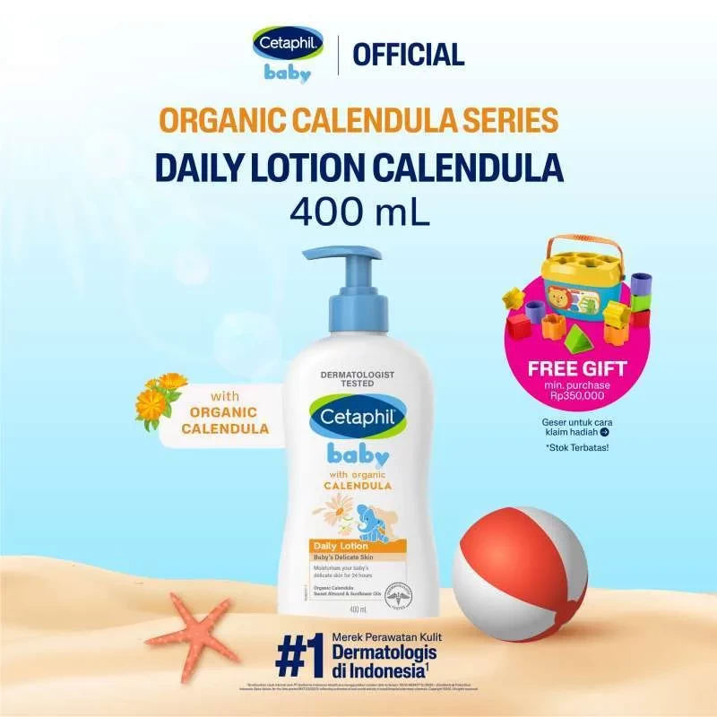 Cetaphil Baby Daily Lotion with Organic Calendula adalah losion perawatan bayi yang sudah diuji secara dermatologis untuk menjaga kelembapan kulit hingga 24 jam dan menutrisi kulit lembut bayi.