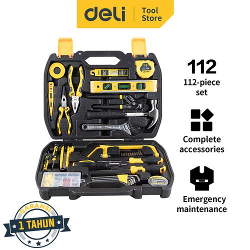 -Terdiri dari 112 pcs alat perkakas: 1 pcs tespen digital, 8 pcs kunci L, 1 pcs cutter, 10 pcs isi pisau cutter, 2 pcs obeng minus 3/6 mm, 1 pcs tang lancip 6 inch, 2 pcs obeng plus PH0/PH2, 1 pcs palu kambing 0,25 kg, 1 pcs kunci sok, 1 pcs kunci inggris 8 inch, 1 pcs tang burung 8 inch, 1 pcs gergaji 6 inch, 1 pcs mini waterpass, 1 kotak baut dan paku, 1 pcs meteran 3 m, 1 pcs isolasi listrik 3 m, 1 pcs isolasi pipa, 10 pcs mata obeng: obeng plus PH1/PH2/PH3, obeng minus 4/6 mm, obeng pozidriv PZ1/PZ2/PZ3, obeng spline T20/T25