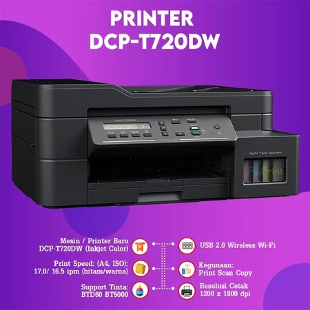 ENTING! Pengguna Mac OS WAJIB BACA: Print dan Scan melalui Mac memerlukan aplikasi Brother iPrint&Scan dari App Store. Dan Aplikasi hanya mendukung format PDF/JPG/BMP dan PNG. Driver printer Mac tidak disediakan. Sehingga jika ingin print selain format diatas atau menggunakan Ms Office, maka harus anda convert terlebih dahulu baru kemudian dapat anda print. Jaminan 100% NEW - Bersegel Resmi - Garansi Resmi / Garansi Toko - Kardus 100% kondisi bagus, tdk rusak / Penyok - Produk baru. - Diharuskan menggunakan Asuransi. Spesifikasi : Print, Scan, Copy Duplex Wireless Kecepatan Cetak A4 Hingga 17 ipm (Hitam)/ 16.5 ipm (Berwarna) WiFi, AirPrint, Mopria, WiFi Direct, USB 2.0 Auto 2-sided (Duplex) printing, 20 sheets Auto-Document Feeder (ADF), 1 line LCD Paper Size : A4, Letter, Legal, Mexican Legal, India Legal, Folio, Executive, B5, A5, B6, A6, C5 Envelope, Com-10, DL Envelope, Monarch, Photo(10x15cm/4x6"), Photo-L(9x13cm/3.5x5"), Photo-2L(13x18cm/5x7"), Index card(13x20cm/5x8") ➖➖➖➖➖➖➖➖➖➖➖➖➖➖ Apa Saja Yang Didapat? • Printer Baru DCP-T720DW • Tinta CMYK 4 botol (sesuai varian) • Kabel Power & Kabel USB • CD Driver • New Box Bergaransi Consumable : Black : BTD60 Color : BT5000 Supported OS: * Windows® 7 SP1/8.1/10 Server 2008/2008 * Untuk MAC OS terbatas fitur