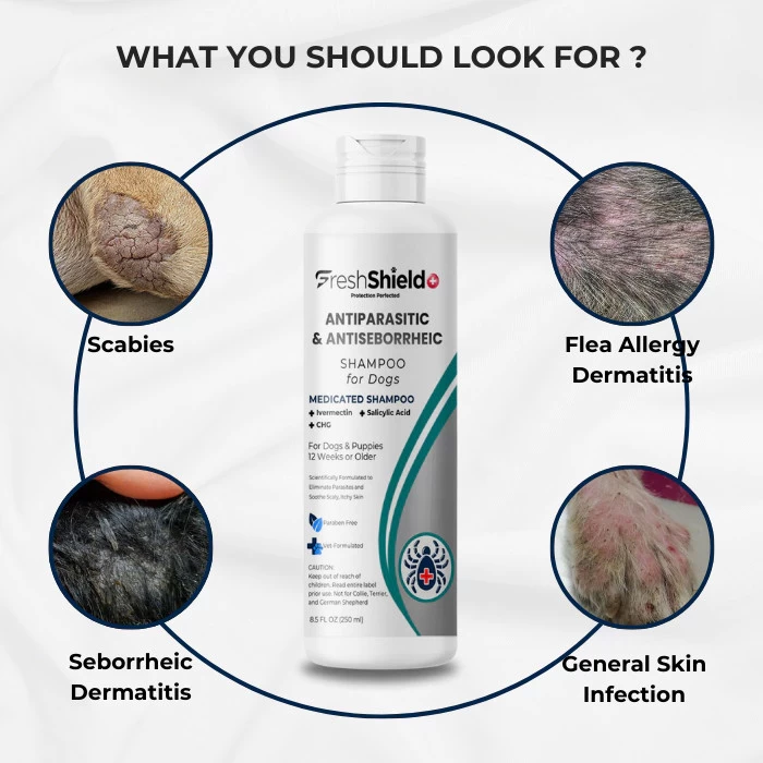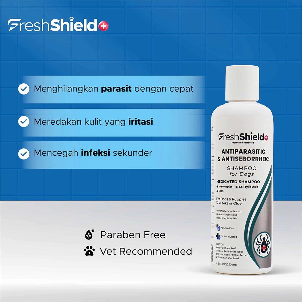 Fresh Shield+ Anti Parasit & Anti-Seboroik untuk Anjing menonjol dari produk sejenis karena kombinasi ampuh Ivermectin, Chlorhexidine Gluconate, dan Salicylic Acid. Campuran ini tidak hanya menargetkan dan menghilangkan parasit tetapi juga menenangkan dan melindungi kulit dari infeksi sekunder. Indikasi: Diindikasikan untuk pengobatan infestasi parasit dan dermatitis seboroik pada anjing. Efektif melawan tungau, kutu, dan parasit eksternal lainnya, sambil juga mengurangi pengelupasan, peradangan, dan mencegah infeksi sekunder. Formulasi: Sampo Medis Bahan: • Ivermectin 2% Tujuan: Antiparasit Fungsi: Menargetkan dan menghilangkan parasit seperti tungau dan kutu dengan mengikat saluran klorida yang dikendalikan glutamat pada sel saraf dan otot parasit, menyebabkan kelumpuhan dan kematian. • Chlorhexidine Gluconate (CHG) Tujuan: Antimikroba Fungsi: Mengurangi populasi bakteri dan jamur pada kulit, mencegah infeksi sekunder yang memperburuk dermatitis seboroik. • Asam Salisilat Tujuan: Keratolitik dan Anti-inflamasi Fungsi: Mempromosikan pengelupasan lapisan luar kulit, menghilangkan sisik dan kerak, serta mengurangi kemerahan dan iritasi. Manfaat Utama: • Menghilangkan Parasit dengan Cepat: Efektif melawan tungau, kutu, dan parasit eksternal lainnya. • Meredakan Kulit yang Iritasi: Mengurangi kemerahan, pengelupasan, dan peradangan yang terkait dengan dermatitis seboroik. • Mencegah Infeksi Sekunder: Sifat antimikroba membantu mencegah infeksi bakteri dan jamur. Petunjuk: Dosis yang Direkomendasikan: Basahi bulu anjing Anda secara menyeluruh dengan air. Oleskan sampo dengan murah hati, buat busa yang kaya, dan pijat dalam-dalam ke bulu dan kulit. Biarkan sampo selama 5-10 menit, lalu bilas hingga bersih dengan air. Ulangi jika diperlukan. Gunakan sekali atau dua kali seminggu sesuai arahan dokter hewan Anda. Petunjuk Penyimpanan: Simpan pada suhu kamar antara 4° - 25°C. Hindari paparan sinar matahari langsung. Ukuran: 250 ml