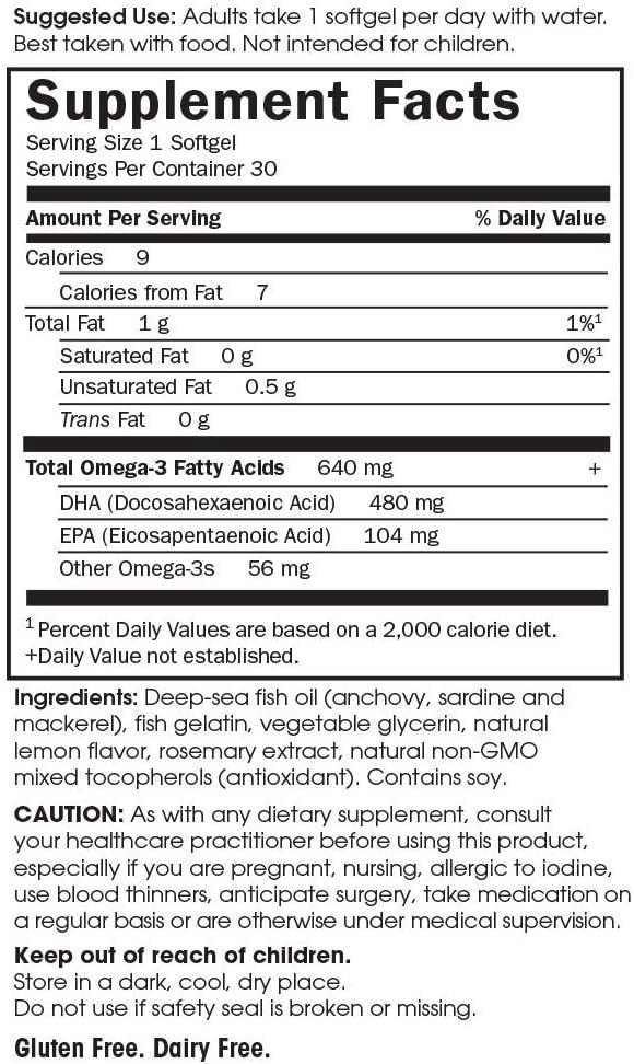 Deep-sea fish oil (anchovy, sardine and mackerel), fish gelatin, vegetable glycerin, natural lemon flavor, rosemary extract, natural non-GMO mixed tocopherols (antioxidant). Contains soy.