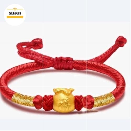 charm emas 24 karatGelang merah atau bisa pilih biru untuk hadiah bayi, dengan chsrm dari emas 24 karat bentuk pundi tulisan fuk (keberuntungan), dengan berat 0.17 gram