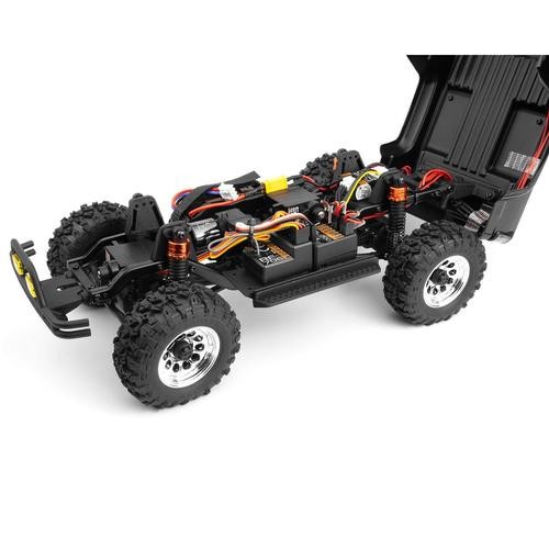 The Venture18 features a fully licensed clipless 1985 Toyota Hilux polycarbonate bodyshell, complete with hard plastic detailing. This scale body enhances the crawler’s appearance with authentic details, making it a standout choice for enthusiasts who value realistic designs. The clipless mounting system ensures a clean, seamless look while maintaining durability during use.