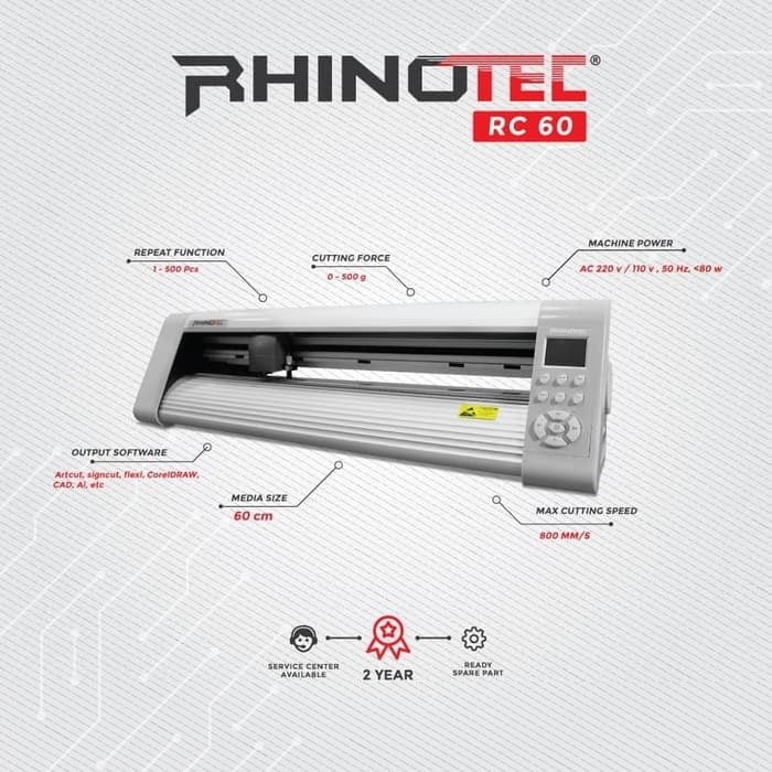 Mesin rhinotec rc-60 adalah mesin cutting dengan area potong 60 cm. Sudah Support Coreldraw , CAD , Adode Illustrator , Artcut , Signcut flexi , dan direct output using USB. Satu-satunya mesin cutting sticker / polyflex dengan garansi 2 Tahun. Kelebihan cutting sticker Rhinotec RC-60X Mesin Bandel Support Contour Cut Design mesin yang modern Cutting precision 2,5mm User Friendly Dapat memotong langsung dari CorelDraw/Adobe Illustrator
