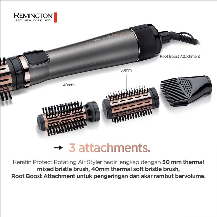 Keratin Protect Rotating Air Styler hadir lengkap dengan sisir 50mm dan 40mm, sehingga Anda dapat memilih sisir ukuran terbaik untuk Anda, apakah Anda mencari volume atau natural blow.