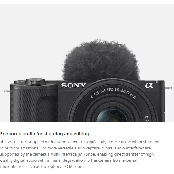 Sony ZV-E10 II Mirorrless Camera With Kit 16-50mm II + shotgun ECM-M1 Microphone Free : 1x Sony Limited Edition Travel Camera Pouch 1x Battery NP-FZ100 1x Memory Card 64GB Features of the Sony ZV-E10 II : >Record high-quality video with endless creative possibilities >Ideal for content creators, both on-the-go and in the studio >Film in 4K 60fps, 4:2:2 10-bit >S-Cinetone, Creative Look and setting for cinematic vlogs >LUT imports, Slog 3 and XAVC S-I recording format for creative control >Precise AF system with human and animal recognition >Clear sound with directional microphone >Stay connected, use the camera for livestreaming with FHD output or via a USB-C cable >Quickly transfer all images via 5GHz Wi-Fi or cable >Dimensions: 114.8 x 67.5 x 54.2 mm >Weight: 379 grams >759-Point Fast Hybrid Phase Detection Features of the Sony E 16-50mm F/3.5-5.6 OSS II : >Lens mount: Sony E >Focal length: 16-50mm >Aperture: 22 - 36 >Aperture: 3.5 - 5.6 >Aperture blades: 7 >Focusing distance: 25 cm >Dimensions (diameter x length): 66 x 31.3 mm >Weight: 107 grams Features of the Sony shotgun ECM-M1 microphone : >8-in-1 Shotgun microphone >Eight different recording modes >Super-directional / Unidirectional / Omnidirectional / Super-directional (rear) / Super-directional (front and rear) / Super-directional (front and rear separately) / Stereo / Ultra-directional >Controllable via turning wheel >Noise Cancelling function >MI (multi-interface) shoe technology >Battery and cable-free >Compact and lightweight design >Dimensions: 40 x 72.2 x 64.4 mm >Weight: 65g Package contents : 1x Sony ZV-E10 II Mirrorless Camera 1x Sony ALC-B1EM Body Cap for E-Mount Cameras 1x Sony NP-FZ100 Rechargeable Lithium-Ion Battery (2280mAh) 1x Furry Windscreen 1x Shoulder Strap 1x Sony E PZ 16-50mm f/3.5-5.6 OSS II Lens (Sony E, Black) 1x Sony ALC-F405S 40.5mm Front Lens Cap 1x Sony ALC-R1EM Rear Lens Cap