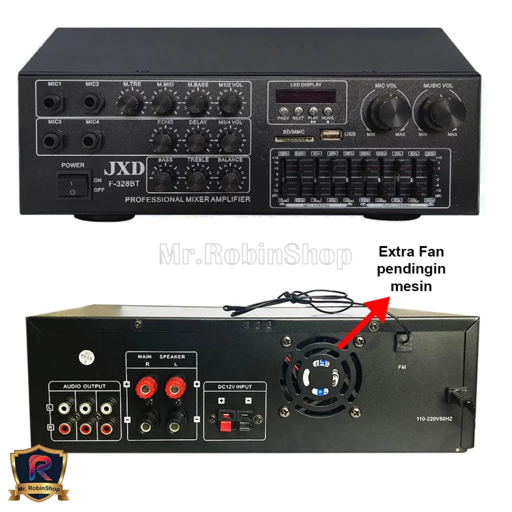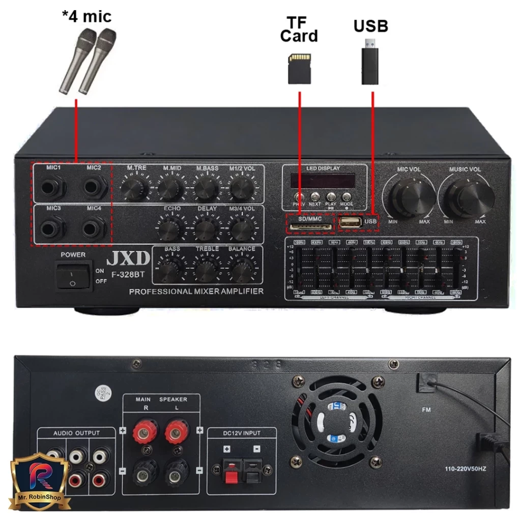 Amplifier ini juga menerima input microphone sebanyak 4 buah