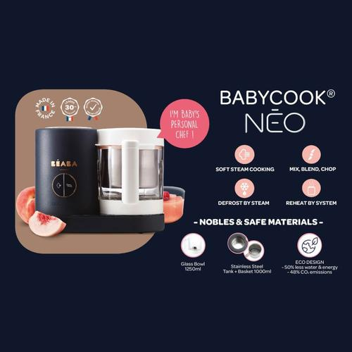 Babycook Neo adalah mesin pembuat makanan bayi terbaru dengan eco technology 4 in 1 yang dapat mengukus, blender, mencairkan, memanaskan kembali, mensterilkan botol dan menghangatkan susu hanya dengan satu tombol. Mengukus cepat hanya dalam 15 menit tanpa menghilangkan kadungan nutrisi dengan menjaga rasa dan vitamin. Mangkuk kapasitas ekstra besar dengan kapasitas 1250ml memungkinkan persiapan dalam jumlah besar dalam waktu singkat