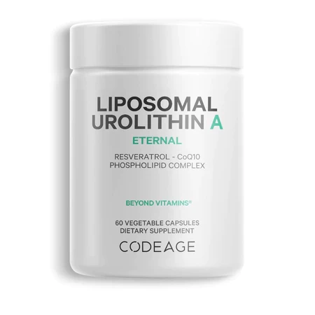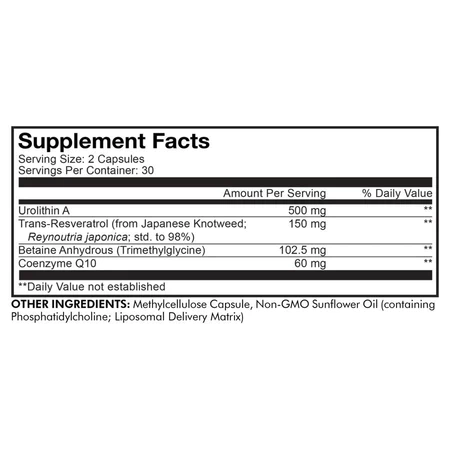 60 Vegetable Capsules Codeage Liposomal Urolithin A supplement features a blend of Urolithin A, resveratrol, betaine anhydrous, and CoQ10. This supplement also includes a liposomal delivery. This Urolithin A supplement provides 500 mg of Urolithin A per serving, combined with trans-resveratrol from Japanese Knotweed, betaine anhydrous, and CoQ10. Codeage Liposomal Urolithin A formula features a liposomal delivery using non-GMO sunflower oil. Urolithin A (UA) is a metabolite produced during the digestion of ellagitannins, which can be obtained from fruits and nuts such as pomegranates, strawberries, and walnuts. Codeage Liposomal Urolithin A is non-GMO, gluten-free, soy-free, dairy-free, and keto-friendly. It is also vegan-friendly. This urolithin supplement is manufactured in the USA with global ingredients in a cGMP-certified facility for quality and purity. Each bottle contains 30 servings for a 1-month supply