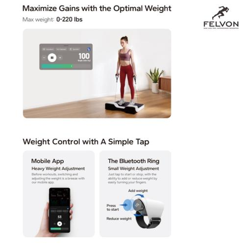 - ⁠berat ringan beban bisa diatur di layar (atau dgn bluetooth ring) sehingga tidak harus manual untuk memindahkan beban saat berolahraga