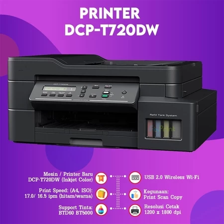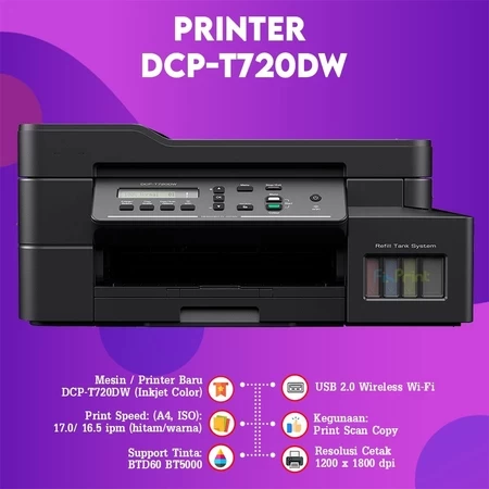 ENTING! Pengguna Mac OS WAJIB BACA: Print dan Scan melalui Mac memerlukan aplikasi Brother iPrint&Scan dari App Store. Dan Aplikasi hanya mendukung format PDF/JPG/BMP dan PNG. Driver printer Mac tidak disediakan. Sehingga jika ingin print selain format diatas atau menggunakan Ms Office, maka harus anda convert terlebih dahulu baru kemudian dapat anda print. Jaminan 100% NEW - Bersegel Resmi - Garansi Resmi / Garansi Toko - Kardus 100% kondisi bagus, tdk rusak / Penyok - Produk baru. - Diharuskan menggunakan Asuransi. Spesifikasi : Print, Scan, Copy Duplex Wireless Kecepatan Cetak A4 Hingga 17 ipm (Hitam)/ 16.5 ipm (Berwarna) WiFi, AirPrint, Mopria, WiFi Direct, USB 2.0 Auto 2-sided (Duplex) printing, 20 sheets Auto-Document Feeder (ADF), 1 line LCD Paper Size : A4, Letter, Legal, Mexican Legal, India Legal, Folio, Executive, B5, A5, B6, A6, C5 Envelope, Com-10, DL Envelope, Monarch, Photo(10x15cm/4x6"), Photo-L(9x13cm/3.5x5"), Photo-2L(13x18cm/5x7"), Index card(13x20cm/5x8") ➖➖➖➖➖➖➖➖➖➖➖➖➖➖ Apa Saja Yang Didapat? • Printer Baru DCP-T720DW • Tinta CMYK 4 botol (sesuai varian) • Kabel Power & Kabel USB • CD Driver • New Box Bergaransi Consumable : Black : BTD60 Color : BT5000 Supported OS: * Windows® 7 SP1/8.1/10 Server 2008/2008 * Untuk MAC OS terbatas fitur
