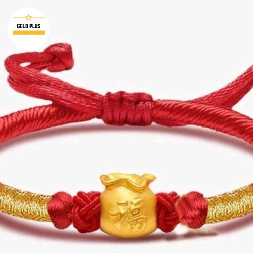 charm emas 24 karatGelang merah atau bisa pilih biru untuk hadiah bayi, dengan chsrm dari emas 24 karat bentuk pundi tulisan fuk (keberuntungan), dengan berat 0.17 gram