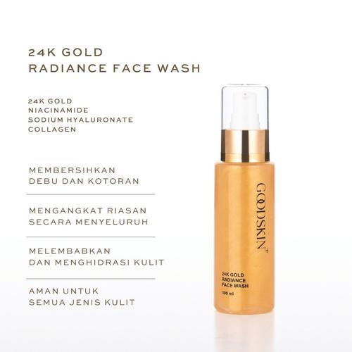 Bersihkan wajah menggunakan Goodskin+ 24K Gold Radiance Facial Wash untuk mengangkat debu, kotoran, dan sisa riasan wajah.