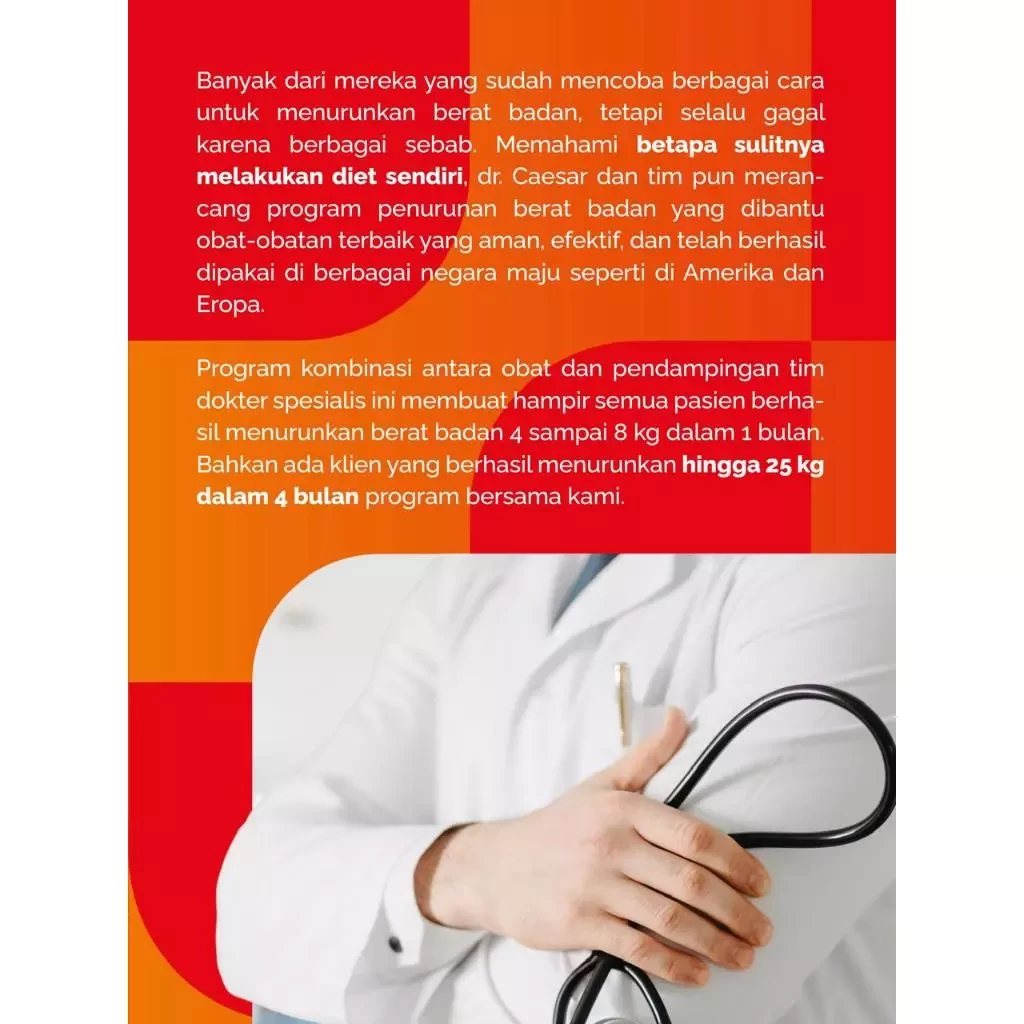 Program Diet Premium 1 bulan terdiri dari: - Pendampingan privat tim dokter (online) 1 bulan - Obat diet premium 30 kapsul untuk 1 bulan NB: Obat diet adalah racikan dokter spesialis. Semua bahan racikan aman & sudah BPOM. Bagaimana program pendampingan dokternya? - Setelah obat dikirim, peserta program akan didampingi tim dokter selama 1 bulan melalui grup WA Privat. Akan diajari cara makannya, diberi foto contoh makanan, evaluasi progress, & diskusi sepuasnya tentang obat, dll sehingga BB turun 4-8 kg sebulan. Ada call dengan dokter di awal program untuk konsultasi. Apa manfaat obat premium? - Obat premium bermanfaat untuk membakar lemak, menurunkan nafsu makan, kenyang lebih cepat & tahan lama, sehingga mudah mengatur pola makan yang benar dan cepat turunkan BB. - Obat premium diminum 1 x sehari di pagi hari. Bagaimana dengan garansinya? - Untuk program diet premium dan ultimate, jika sudah minum obat rutin dan mengikuti semua arahan program pendampingan, tapi di akhir program BB belum turun, uang akan dikembalikan 100%. Garansi ini hanya berlaku untuk peserta program, dan tidak berlaku untuk yang membeli obat saja.