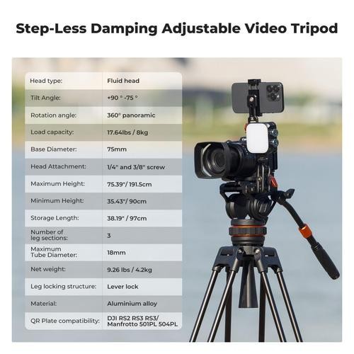 *Professional-grade fluid head provides smooth camera movement, suitable for video and fine composition, ensuring shooting stability. Panoramic shooting is equipped with infinitely adjustable damping, which can easily adjust the damping feel and achieve 360-degree horizontal rotation, providing precise control and quick adjustment to meet more shooting needs.