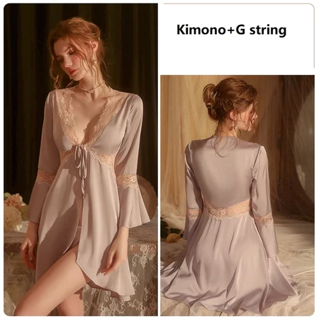 Kimono +G string Baju Tidur Sexy Lingerie Wanita Satin premium Dress Y70