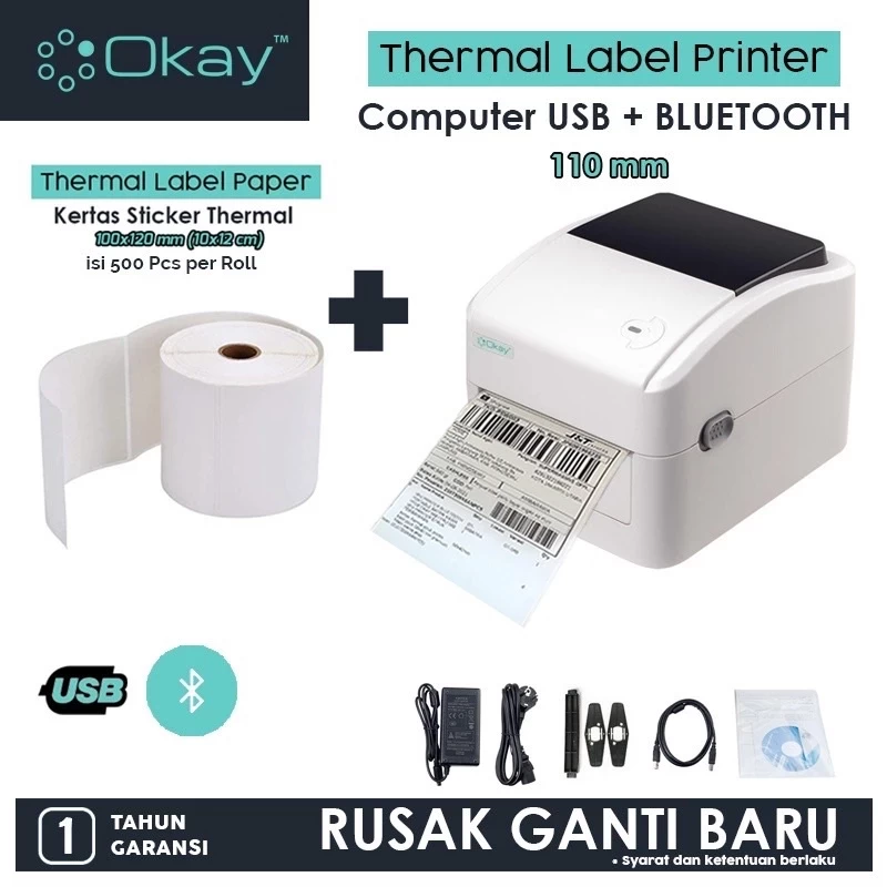 D100 (USB SAJA) = USB D100 (HITAM) = USB + BLUETOOTH D100 (PUTIH) = USB + BLUETOOTH untuk variasi +NEW = Dapat 1 Roll Kertas Label 100x150mm isi 500pcs / Lembar Printer dapat mencetak barcode cocok untuk, memberi kode barang dengan BARCODE, LABEL PENGIRIMAN, LABEL HARGA, LABEL BAJU, Label minuman/makanan dan label sticker lainnya, rumah sakit, Apotek, LOGISTIK, Warung, restoran, Kasir, Supermarket, rumah tangga, Dan lain sebagainya. 4 inches label printer. Its shell design looks so elegant . Having a space-saving body but keeping a large paper loading container.One multi-functional button and one two-color indicator, simple operation. Resolution, 203 DPI Printing method Direct Thermal Max.print speed 152 mm (6") / s Max. Max.print width 104 mm (4.09”) Max.print length 1778 mm(70'') Media type, gap, black mark, fan-fold and punched hole Media width; 25.4 mm ~ 118 mm (1.0"-4.6") Media thickness; 0.06~0.254 mm (2.36~10mil) Media core diameter 25.4 ~ 76.2 mm (1 "~ 3 ") Label length; 10 mm ~1778 mm Processor; 32-bit CPU Memory 8MB Flash Memory, 8MB SDRAM, Flash memory can be expanded to Max. 4 GB Interface Standard version: USB + bluetooth Sensors, Gap sensor, Cover opening sensor, Black mark sensor, Ribbon sensor Fonts/Graphics/Symbologies Internal fonts, 8 alpha-numeric bitmap fonts, Windows fonts are downloadable from software. 1D bar code Code 39, Code 93, Code 128UCC, Code 128 subsets A, B, C, Codabar, Interleaved 2 of 5, EAN-8, EAN-13, EAN-128, UPC-A, UPC-E, EAN and UPC 2(5) digits add-on, MSI, PLESSEY, POSTNET, China POST, GS1 DataBar, Code 11 2D bar code, CODABLOCK F mode, DataMatrix, Maxicode, PDF-417, Aztec, MicroPDF417, QR code, RSS Barcode (GS1 Databar) Rotation 0°、90°、180°、270° Emulaion TSPL、EPL、ZPL、DPL Physical Features Dimension 282 mm (L) x 232 mm (W) x 171 mm (H) Weight 1.31 kg Driver, Windows/ Linux/Mac Android and ios Power supply Input,AC 110-240V Output,DC 24V-2.5A Paper roll spindle Extension board for external paper roll holder - Modren appearance design. - Faster printing speed, 6 inches 152mm/s Max., to improve the daily efficiency.