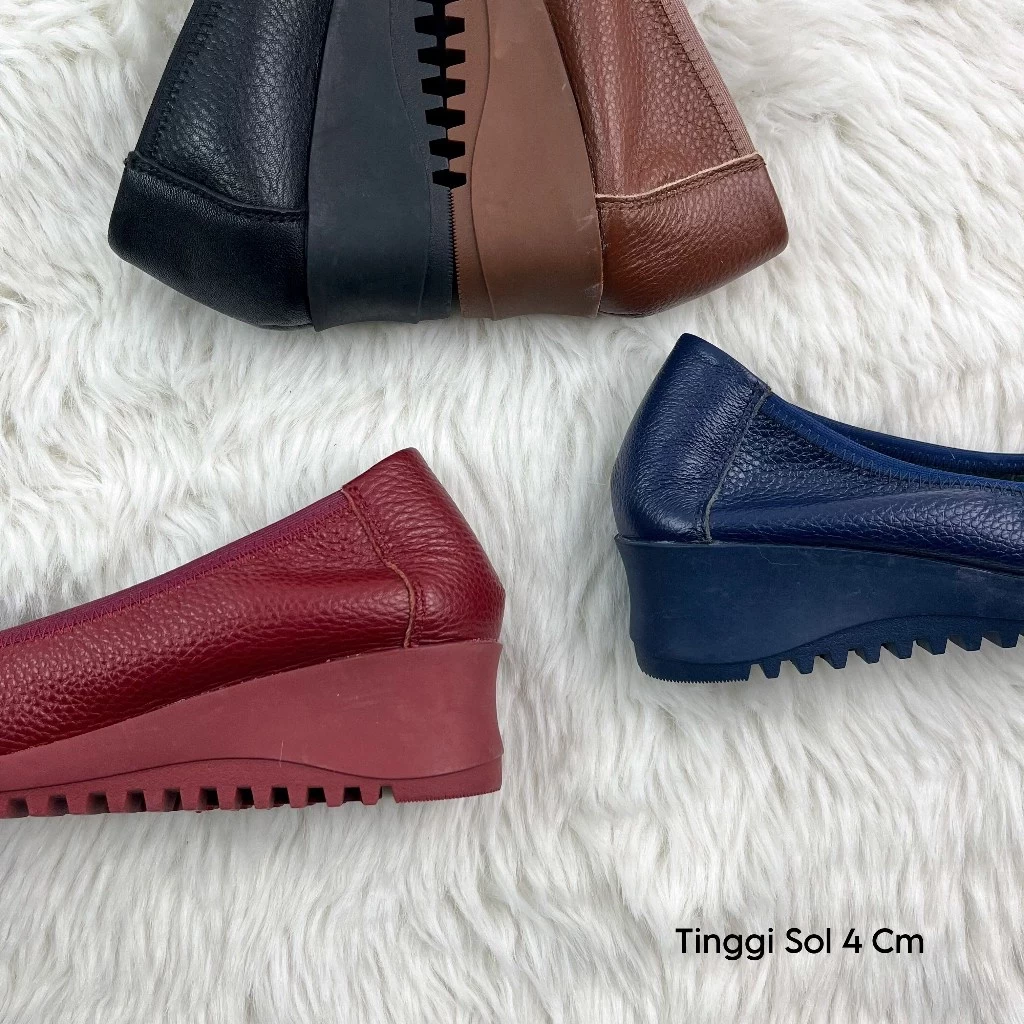 nsole 36= 23cm. 37= 23,5cm. 38= 24cm. 39= 24,5cm. 40= 25cm. 41= 25,5cm. Detail Produk : Tipe : Wedges 4 cm ( Tipe Sepatu ini normal size ) Warna : Black, Black-Glossy, Navy, Light Brown, Maroon, Khaki, Dark Brown Bahan : Kulit Sapi Asli 100% Fitur : Ringan, Super Empuk, Lembut & Lentur, Nyaman di pakai Model Simple dan Elegan