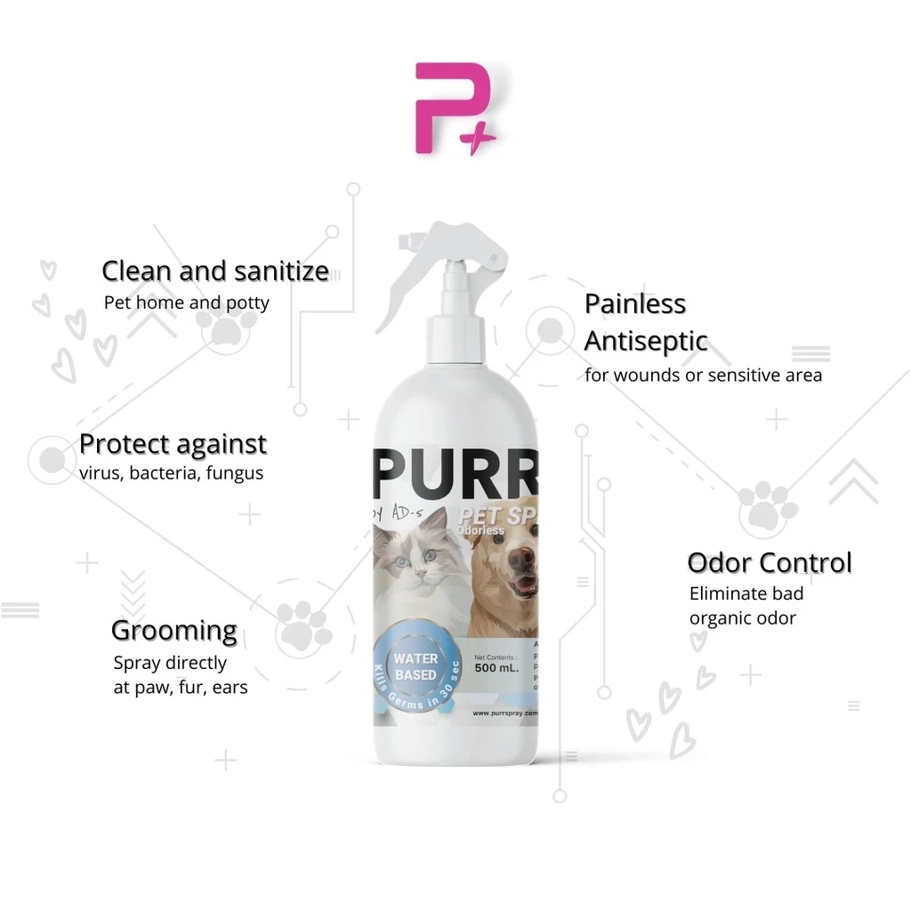 PURR+ Premium Pet Spray merupakan ion-activated water yang aman apabila tidak sengaja tertelan maupun terhirup anabul kesayangan kamu! PURR+ Pet Spray direkomendasikan 9 dari 10 pet lovers/pet owners. PURR+ sangat efektif untuk: * Melindungi anabul dari kuman, virus, dan jenis jamur tertentu * Menghilangan bau tubuh, maupun bau kandang * Membersihkan seluruh bagian tubuh anabul maupun area sensitive seperti bagian bawah mata, hidung, telinga, dll * Mempercepat penyembuhan luka dan/atau infeksi * Membersihkan/mensanitasi kandang, peralatan, maupun mainan anabul * Pengganti mandi bagi bayi anabul maupun anabul yang tidak boleh (sering mandi) * Aman apabila tidak sengaja terhirup, terminum, tertelan, atau terjilat oleh anabul yang beratnya diatas 100 gram