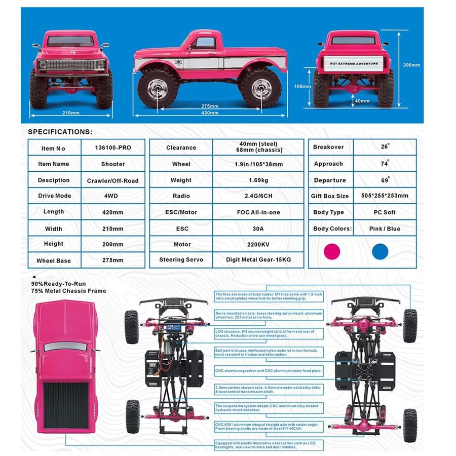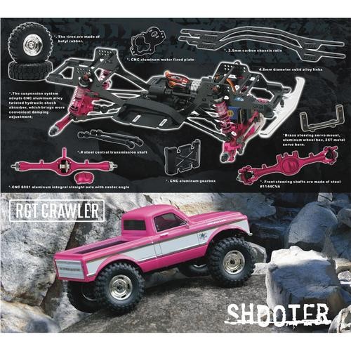 136100PRO "Shooter", an LCG-FOC brushless version and 1/10 high-performance crawler, is jointly developed by RGT and Hobbywing Technology. "Shooter" is RGT's first RTR vehicle equipped with brushless motor and low center of gravity structure. The new design is reflected in its excellent material usage,75% of vehicle chassis is assembled with CNC metal material parts, and the material consists of carbon, copper, 45# steel and aluminum. "Shooter" has distribution structure, motor-mounted in front, and the counterweight ratio is 6/4 at front and rear of chassis. "Shooter" is equipped with an all-in-one brushless FOC ESC motor, the ESC is 30 A and the brushless motor is 2200KV. The internal rotor magnetic field directional control drive mode has strong low-speed torque and super good linearity, and the motor runs smoothly and quietly, with excellent waterproof and dustproof performance, easily coping with various climates and site environments. "Shooter" comes in two colors, one is lively and cute pink body with pink metal axles, and the other is metal blue body with calm black metal axles.
