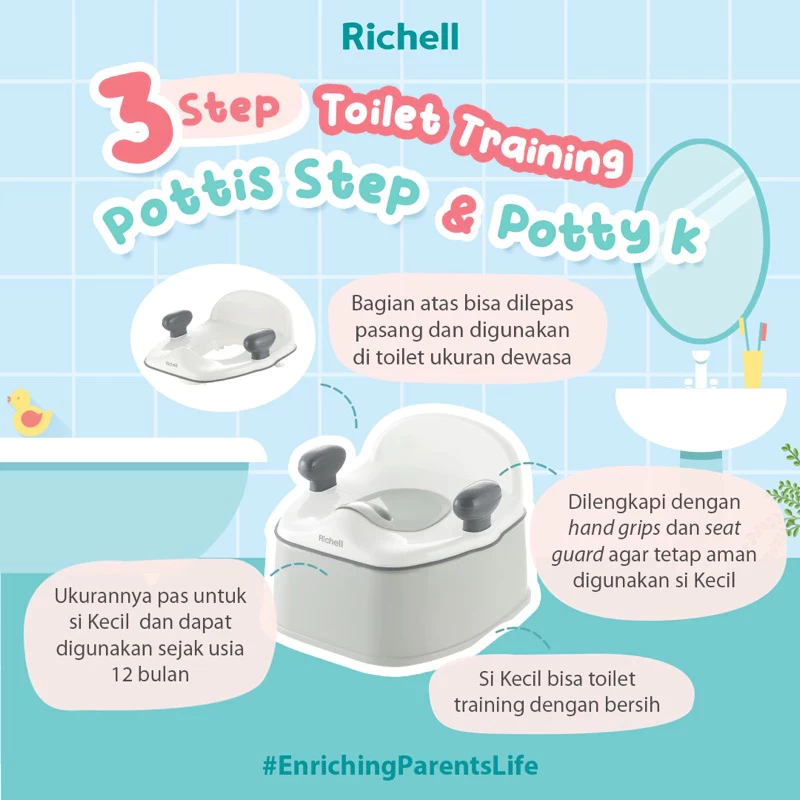 Toilet training atau kegiatan mengajarkan si Kecil untuk buang air sendiri penting untuk dilakukan sedini mungkin agar Ia belajar untuk mandiri, memahami keteraturan akan kapan, dimana, dan bagaimana melakukan buang air yang benar, serta mengenal pentingnya kebersihan diri dan sekitar. Selain itu, semakin dini si Kecil mengenal aktivitas ke toilet, semakin cepat Ia lepas dari ketergantungan akan pemakaian popok, dan Ia pun siap untuk bertumbuh lebih besar lagi. Pottis Step dan Potty K hadir untuk membantu Parents mendampingi si Kecil untuk melakukan toilet training. Pottis Step dan Potty K merupakan pispot yang dapat si Kecil gunakan untuk mempermudah saat Ia hendak melakukan aktivitas buang air. Memiliki handle di kedua sisi serta bagian tengahnya sedikit lebih tinggi untuk membuat posisi kaki tertutup dan lebih turun dan mencegah adaanya cipratan cairan.