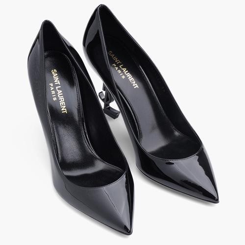 SAINT LAURENT Opyum 85mm Pumps in Black Patent with Black Logo HeelsSize 36 - insole 23 (CM)Size 37 - insole 24 (CM)Size 38.5 - insole 25.5 (CM)