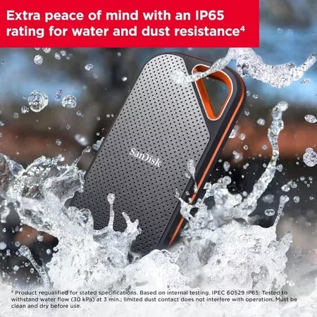 Powerful NVMe solid state performance featuring up to 2000MB/s read/write speeds.(1) (Based on internal testing; performance may be lower depending on host device, interface, usage conditions and & other factors. 1MB=1,000,000 bytes.) A forged aluminum chassis acts as a heatsink to deliver higher sustained speeds in a portable drive that’s tough enough to take on any adventure. Up to 3-meter drop protection and IP65 water and dust resistance(4), and a handy carabiner loop. (Previously rated for 2-meter drop protection and IP55 rating. Now qualified for the higher, stated specs.) Help keep private content private with the included password protection featuring 256‐bit AES hardware encryption.(3)