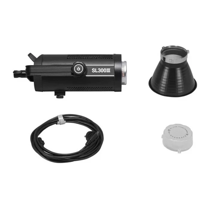 % In the Box % - Lampu Godox SL-300III -Protection Cover -Power Cable / Adaptor Charger -Led Reflector Key Features : For Studio and Film/TV Production Output: 99,300 Lux, 330W 5600K Color Temperature, 96 CRI On/Off Quiet Fan Cooling, Dims 0-100% 360° Rotatable Yoke, Special Effects 32 Channels, 16 Groups Remote Control The SL-300III LED Video Light from Godox is a sophisticated light source with a full range of professional features. Color temperature is a solid and dependable 5600K and it has high CRI/TLCI ratings of 96/97 to indicate accurate color reproduction. The light intensity is variable from 0 to 100% and while you can make adjustments locally on the fixture you can also make them from distances up to 164~39; with an optional radio remote or from your smartphone with the Godox app from up to 98~39; away. The fixture is kept cool by two quiet fans that can be turned off in sound sensitive situations.