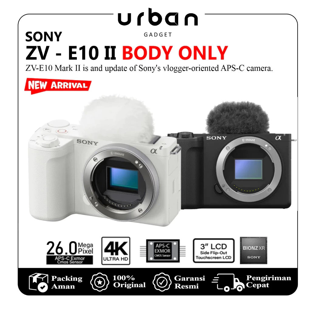 Sony ZV-E10 II Mirorrless Camera With Kit 16-50mm II + shotgun ECM-M1 Microphone Free : 1x Sony Limited Edition Travel Camera Pouch 1x Battery NP-FZ100 1x Memory Card 64GB Features of the Sony ZV-E10 II : >Record high-quality video with endless creative possibilities >Ideal for content creators, both on-the-go and in the studio >Film in 4K 60fps, 4:2:2 10-bit >S-Cinetone, Creative Look and setting for cinematic vlogs >LUT imports, Slog 3 and XAVC S-I recording format for creative control >Precise AF system with human and animal recognition >Clear sound with directional microphone >Stay connected, use the camera for livestreaming with FHD output or via a USB-C cable >Quickly transfer all images via 5GHz Wi-Fi or cable >Dimensions: 114.8 x 67.5 x 54.2 mm >Weight: 379 grams >759-Point Fast Hybrid Phase Detection Features of the Sony E 16-50mm F/3.5-5.6 OSS II : >Lens mount: Sony E >Focal length: 16-50mm >Aperture: 22 - 36 >Aperture: 3.5 - 5.6 >Aperture blades: 7 >Focusing distance: 25 cm >Dimensions (diameter x length): 66 x 31.3 mm >Weight: 107 grams Features of the Sony shotgun ECM-M1 microphone : >8-in-1 Shotgun microphone >Eight different recording modes >Super-directional / Unidirectional / Omnidirectional / Super-directional (rear) / Super-directional (front and rear) / Super-directional (front and rear separately) / Stereo / Ultra-directional >Controllable via turning wheel >Noise Cancelling function >MI (multi-interface) shoe technology >Battery and cable-free >Compact and lightweight design >Dimensions: 40 x 72.2 x 64.4 mm >Weight: 65g Package contents : 1x Sony ZV-E10 II Mirrorless Camera 1x Sony ALC-B1EM Body Cap for E-Mount Cameras 1x Sony NP-FZ100 Rechargeable Lithium-Ion Battery (2280mAh) 1x Furry Windscreen 1x Shoulder Strap 1x Sony E PZ 16-50mm f/3.5-5.6 OSS II Lens (Sony E, Black) 1x Sony ALC-F405S 40.5mm Front Lens Cap 1x Sony ALC-R1EM Rear Lens Cap