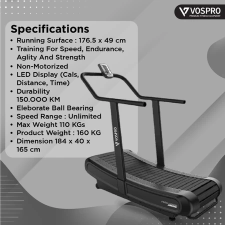 VOSPRO Treadmill Curve Manual Type 6130CB Commercial Fitur : -Running Surface : 176.5 x 49 cm -Non-Motorizes -Training For Speed, Endurance, Aglity And Strength -LED Display ( Cals. distance,time) -Durability 150,000 KM -Eleborate Ball Bearings -Speed Range : Unlimited Spesifikasi : Max Weight : 110 Kg Product Weight : 160 Kg Dimension : 184 x 40 x 165 cm Ketentuan Layanan : 1. Melayani COD untuk Wilayah Jabodetabek. 2. FREE ONGKIR dan FREE PEMASANGAN untuk Jabodetabek dengan radius sampai dengan 50 Km (kontak chat dulu sebelumnya) 3. Untuk pengiriman Jabodetabek silahkan pilih pengiriman “KURIR TOKO” 4. Proses pengiriman Jabodetabek maksimal 1-2 hari kerja atau bisa di kirim di hari yang sama jika masih ada slot tersedia dan order sebelum jam 09.00 WIB( chat admin terlebih dahulu) 5. Untuk pengiriman di luar Jabodetabek akan di kirim melalui ekspedisi dengan tarif menyesuaikan, (untuk info lebih lengkap chat admin terlebih dahulu). 6. Lama pengiriman luar jabodetabek tergantung ekspedisi 7. Berat yang tertera di system adalah 1Kg, hanya untuk pengiriman dokumen/invoice saja. 8. Garansi Distributor Resmi : - Garansi Motor (berlaku khusus treadmill) : 2 Tahun - Garansi Spare Part : 1 Tahun